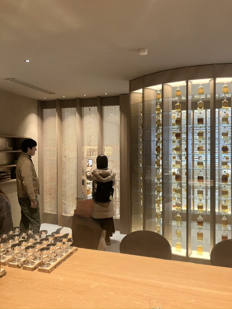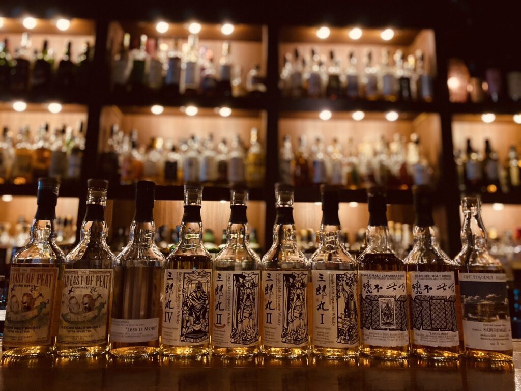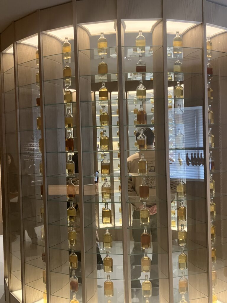 壁一面に並ぶシングルモルトのサンプルは、まるで緻密なパズルのピースのようです。